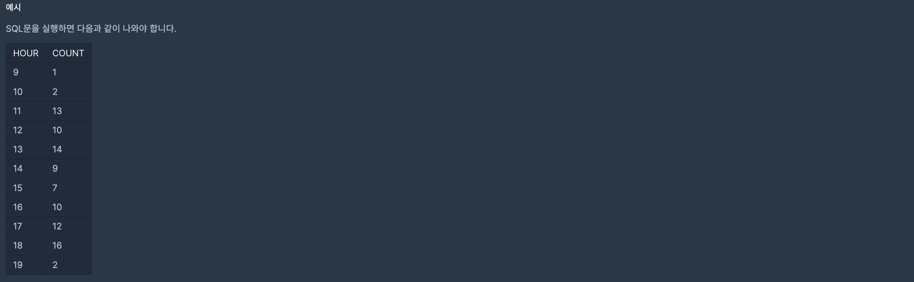 SELECT HOUR(DATETIME) AS 'HOUR', COUNT(DATETIME) AS 'COUNT'