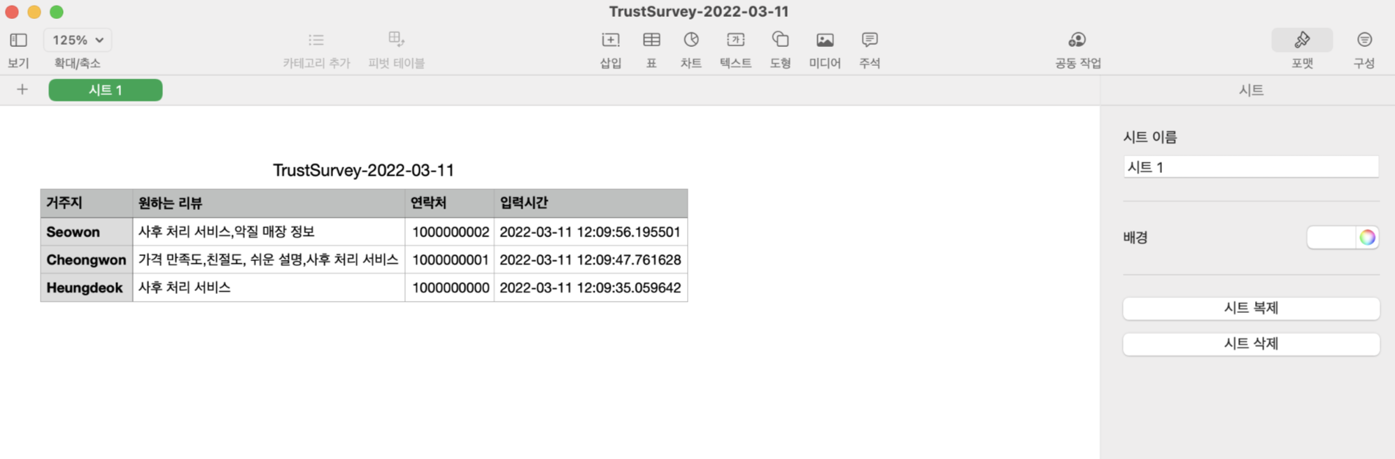 👉🏻모델은 다음과 같다. TrustSurvey 모델에 설문조사한 내용이 저장된다. 설문조사에서 받는 내용은 거주지, 알림받고 싶은 리뷰 종류, 전화번호이고 언제 리뷰를 받았는지는 created_at을 통해 받는다.